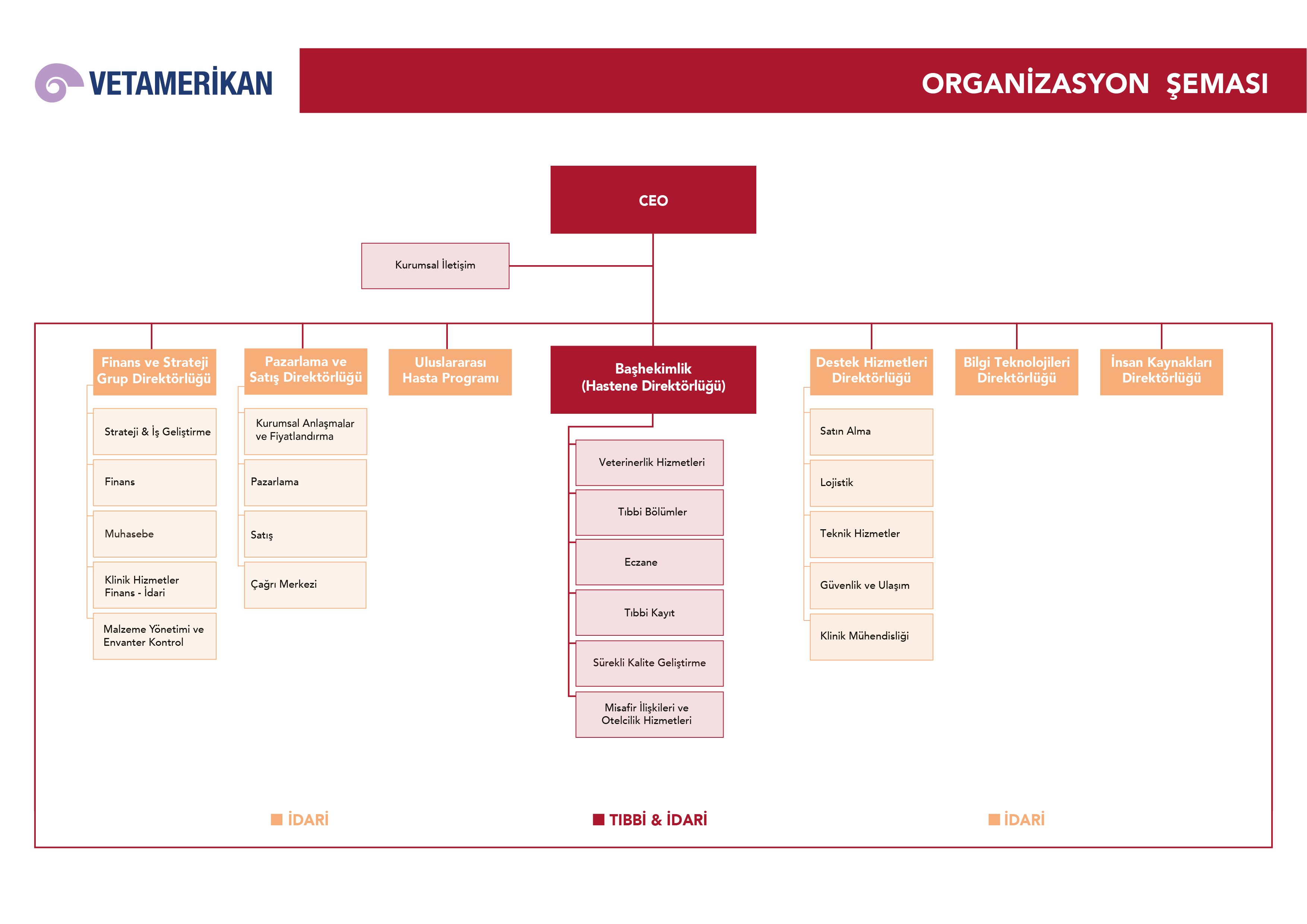 VETAMERICAN PET HOSPITAL KURUMSAL ORGANİZASYON ŞEMASI VE YÖNETİM Sağlık kuruluşlarımız, tıbbi ve idari olarak, liderlerin de küme sözcüsü olarak değerlendirileceği klasik dikey yapılanma yerine, genel müdürün koordine eden bir takım bireyi olarak gözüktüğü hibrit yapılanma şeklinde organize edilmiştir.